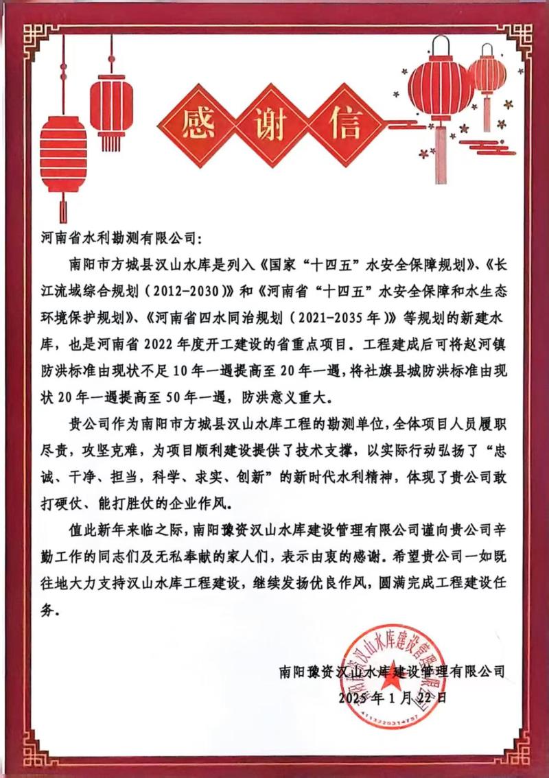 近日,公司陸續(xù)收到新鄉(xiāng)市“四縣一區(qū)”南水北調(diào)配套工程?hào)|線項(xiàng)目、漢山水庫、大別山革命老區(qū)(潢川)現(xiàn)代水網(wǎng)等多家單位向公司發(fā)來感謝信。信中對(duì)公司承擔(dān)的南水北調(diào)配套工程?hào)|線項(xiàng)目、漢山水庫工程、潢川現(xiàn)代水網(wǎng)建設(shè)暨項(xiàng)目有序推進(jìn)表示衷心的感謝,對(duì)公司派出的專業(yè)技術(shù)團(tuán)隊(duì)所展現(xiàn)的良好作風(fēng)及業(yè)務(wù)素養(yǎng)給予肯定。